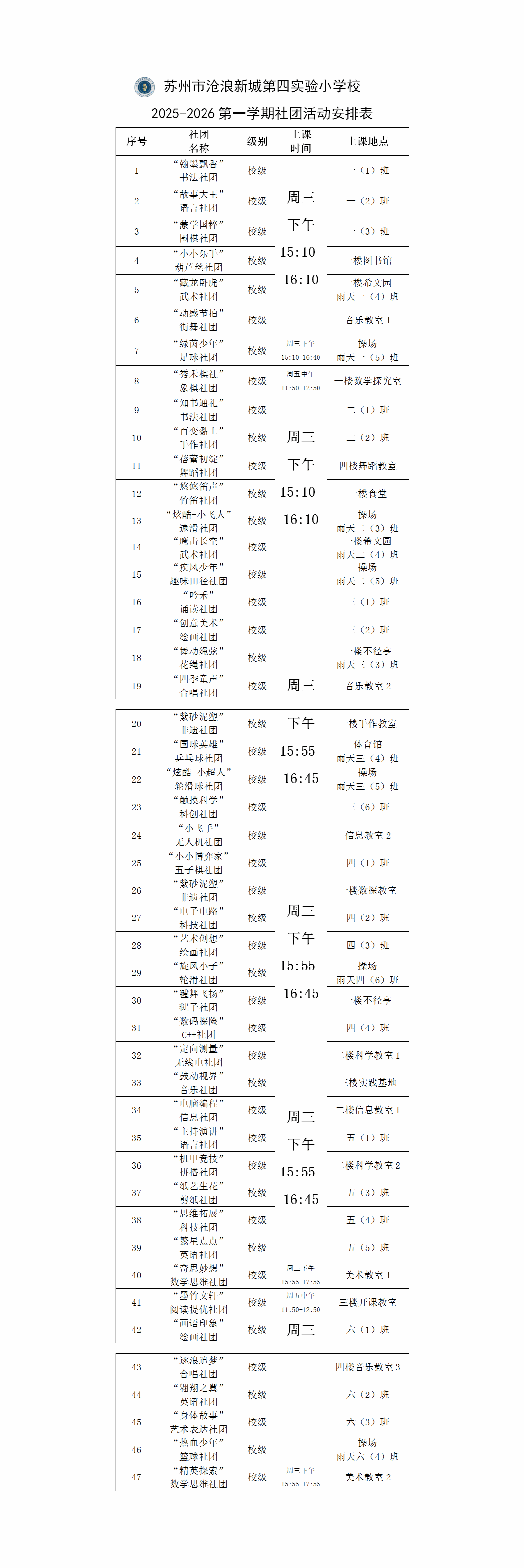 校级社团活动安排表及任课教师(2025-2026第一学期)
