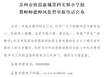 沧浪新城第四实验小学校有偿补课和教师违规收受礼品礼金问题专项整治监督举报电话